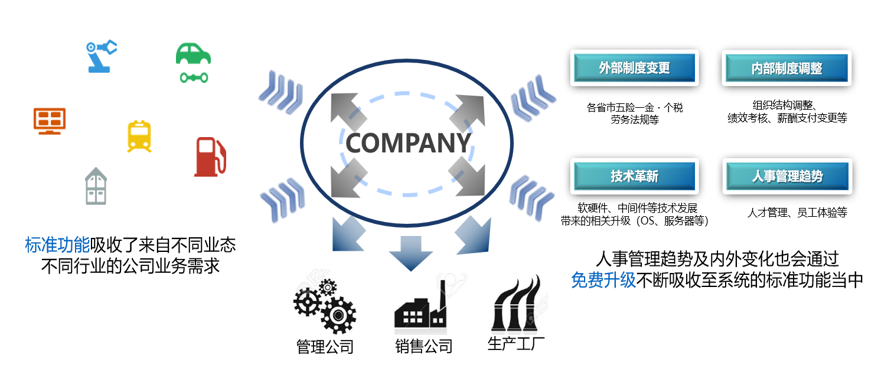 为降低企业系统维护成本,从长远的角度帮助企业构建可以灵活应对内外变化、供用户长期使用的人事系统,COMPANY从开发之初就制定了“免费升级”的理念且一直延续至今。在定额维护费的范围内,免费应对一切变化所带来的产品升级,客户无需额外投入成本,也无需等待漫长的二次开发周期,通过定期升级即可保持产品的最新状态。