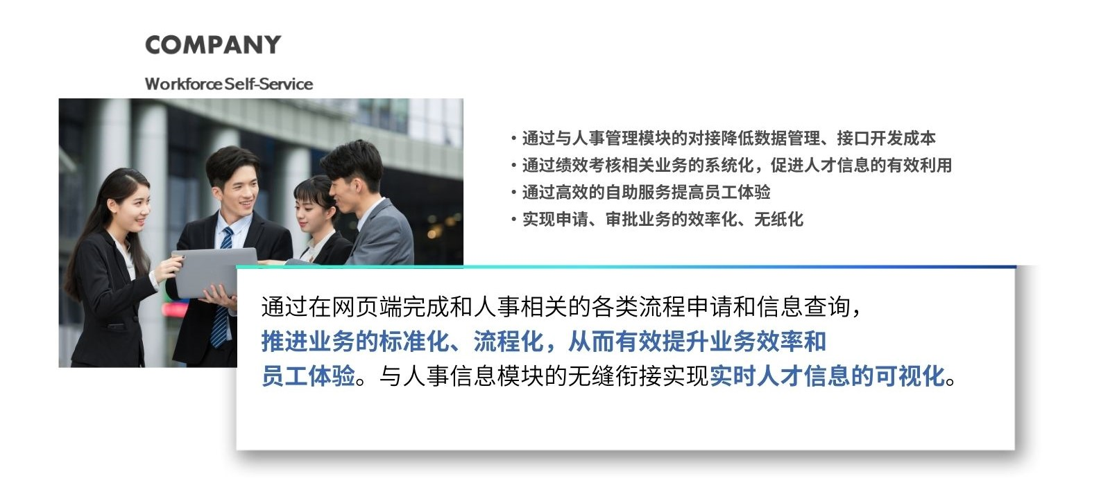 COMPANY人事管理系统包含了上千家大型企业集团的业务流程和经验知识。不论行业及业态,企业所需的各种业务要求和最佳实践都作为COMPANY的“标准功能”提供,并持续不断扩充。因此,无论是复杂的业务流程或是多变的人事制度,基本都可以从丰富的标准功能中选择用户所需的功能,无需额外的二次开发,通过对系统进行参数配置即可满足多样的业务需求。