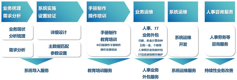 大宇宙集团灵活运用其多年积累的BPO(业务流程外包)解决方案的知识和经验,为客户提供从系统实施至上线后运维、业务改善提案等完整的一站式服务。